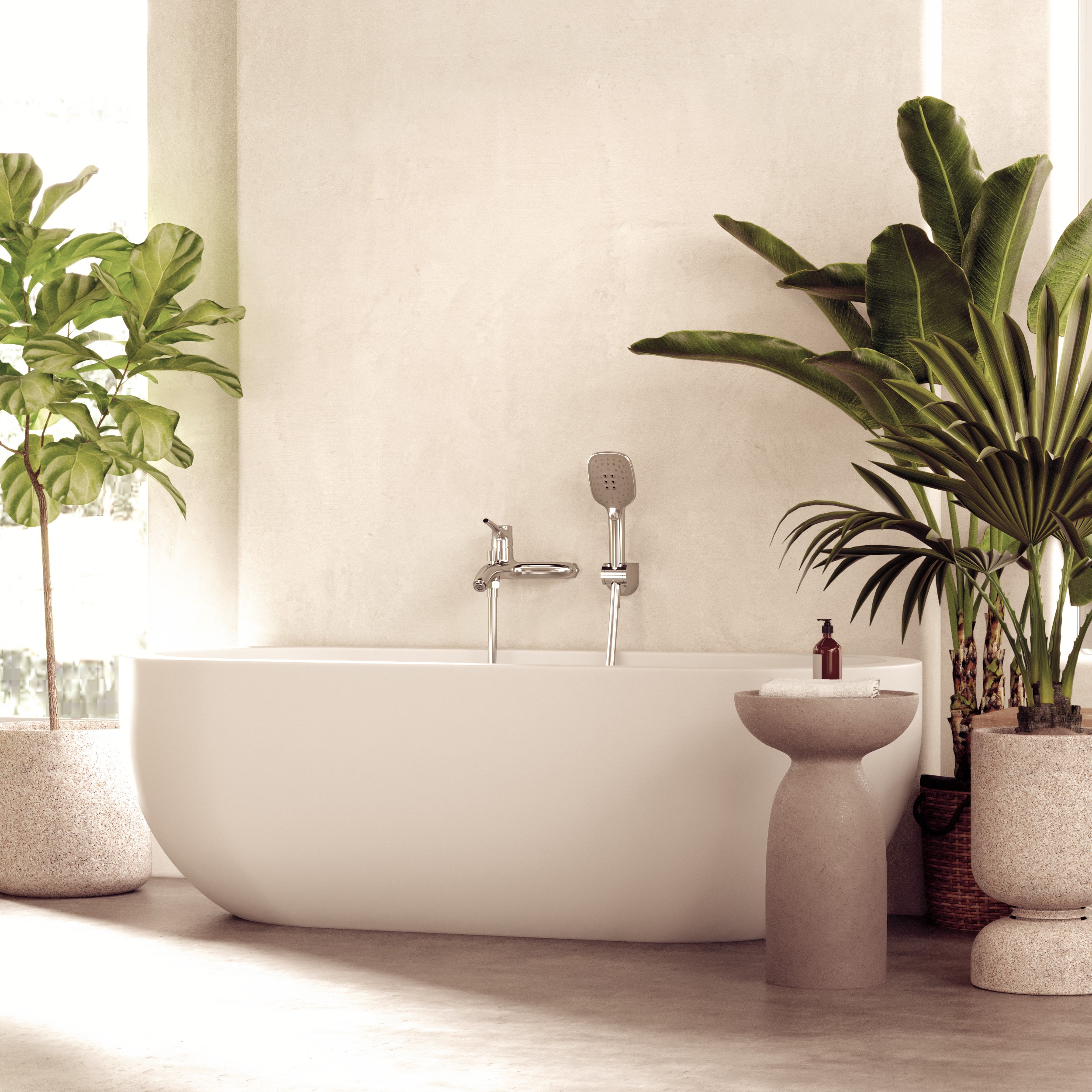 Single shower/bath mount mixer, with eccentric couplings with diverter valve. Self cleaning hand shower included.